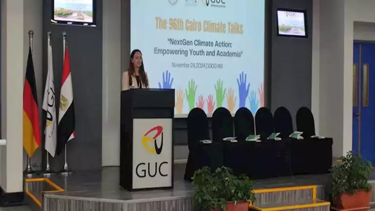 افتتح الدكتور ياسر حجازي رئيس الجامعة الألمانية بالقاهرة فاعليات أعمال محادثات القاهرة للمناخ في نسختها ال96 والتي أقيمت بالتعاون الثنائي بين الجامعة الألمانية بالقاهرة و السفارة الألمانية بالقاهرة، بتنظيم الدكتورة شيرين البرادعي الأستاذ المساعد ببرنامج الهندسة المدنية بالجامعة الألمانية، لورينا موهر، رئيسة قسم العلوم والبروتوكول في السفارة الألمانية بالقاهرة
