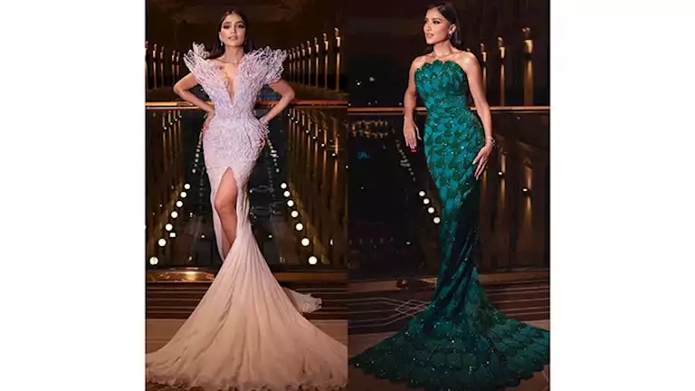 ارتدت فستانًا من تصميم وعد العقيلي. الفستان مصنوع من الكريب، وجاء بقصة strepless مع ذيل طويل يضفي طابعًا ملكيًا على الإطلالة، ومصنوع بالكامل من التطريزات اليدوية، والتصميم مستوحى من الطبيعة، والتطريزات وكأنها تحاكي قشور السمك بألوان متدرجة بين الأخضر والأزرق. بحسب ما وضحت دار أزياء وعد العقيلي لـ مصراوي.