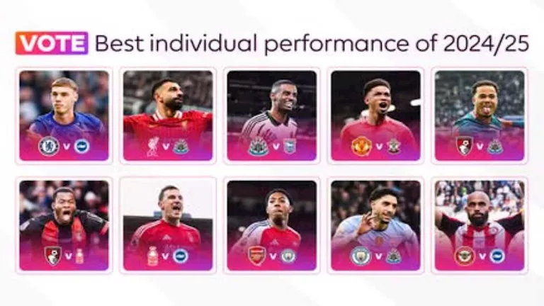 أعلنت رابطة الدوري الإنجليزي الممتاز عن المرشحين لجائزة أفضل أداء فردي خلال مباراة في الموسم الماضي من الدوري الإنجليزي.