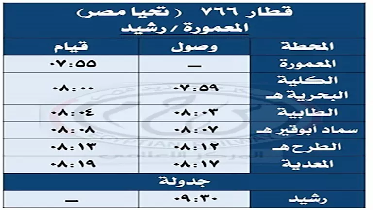 قطار 766 (تحيا مصر) المعمورة / رشيد: موعد القيام الجديد الساعة 07:55 صباحًا بدلاً من 07:50 صباحًا.