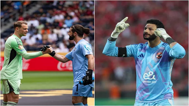 عادل حارس المرمى الألماني لفريق بايرن ميونخ مانويل نوير الرقمي التاريخي لحارس مرمى الأهلي محمد الشناوي في كأس العالم للأندية.