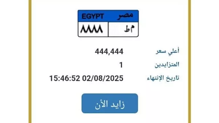 أعلنت بوابة مرور مصر الإلكترونية عن طرح لوحة معدنية مميزة للسيارات في مزاد إلكتروني، تحمل الرقم “م ط 8888″، ووصل سعرها حتى الآن إلى 444 ألف جنيه، وسط استمرار التزايد عليها من شخص واحد فقط حتى هذه اللحظة.