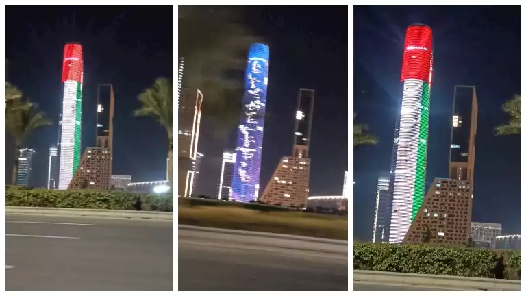 تزين البرج الأيقونى بالعاصمة الإدارية الجديدة، بعلم دولة الإمارات العربية المتحدة، احتفالًا بـ اليوم الوطني الـ 53 للإمارات.