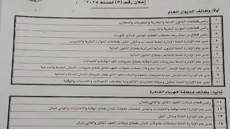 وحصل “مصراوي”، على صورة للقرارات والتي تتمثل في وظائف في الديوان العام للشركة المصرية لنقل الكهرباء ، ومنطقة كهرباء القاهرة ، وكذلك منطقة الإسكندرية وغرب الدلتا ، ومنطقة كهرباء الدلتا ، ومنطقة كهرباء القناة ، بالإضافة إلي منطقتي كهرباء مصر الوسطي ، ومصر العليا.