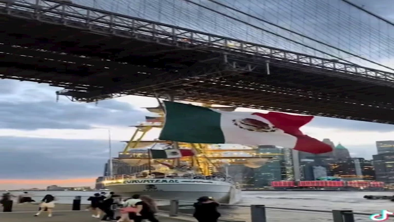 وأظهر مقطع فيديو التقطه شهود عيان للاصطدام الذي نشر على الإنترنت صاري السفينة، الذي كان يرفع علما مكسيكيا عملاقا باللون الأخضر والأبيض والأحمر، وهو يحتك بالجزء السفلي من الجسر.