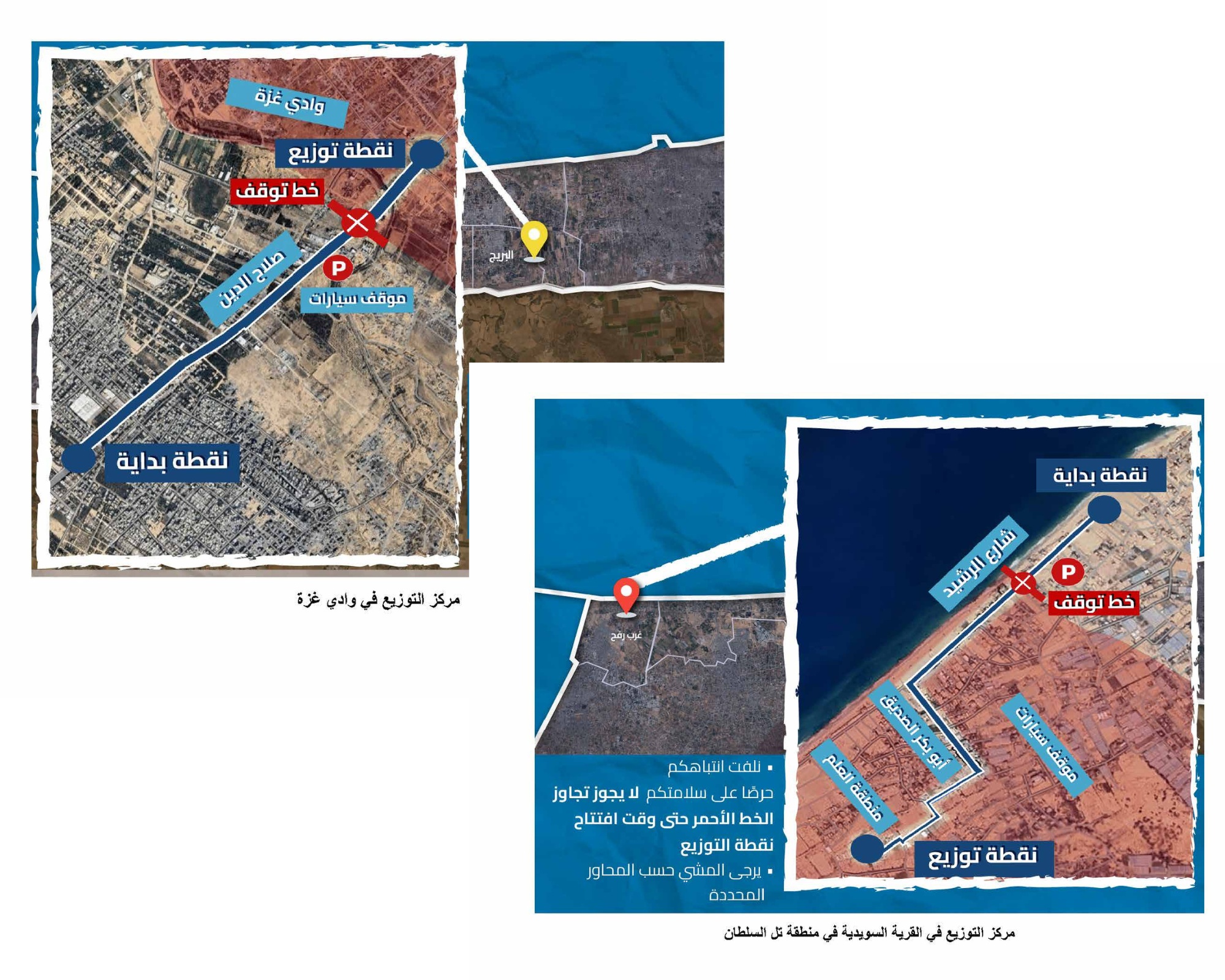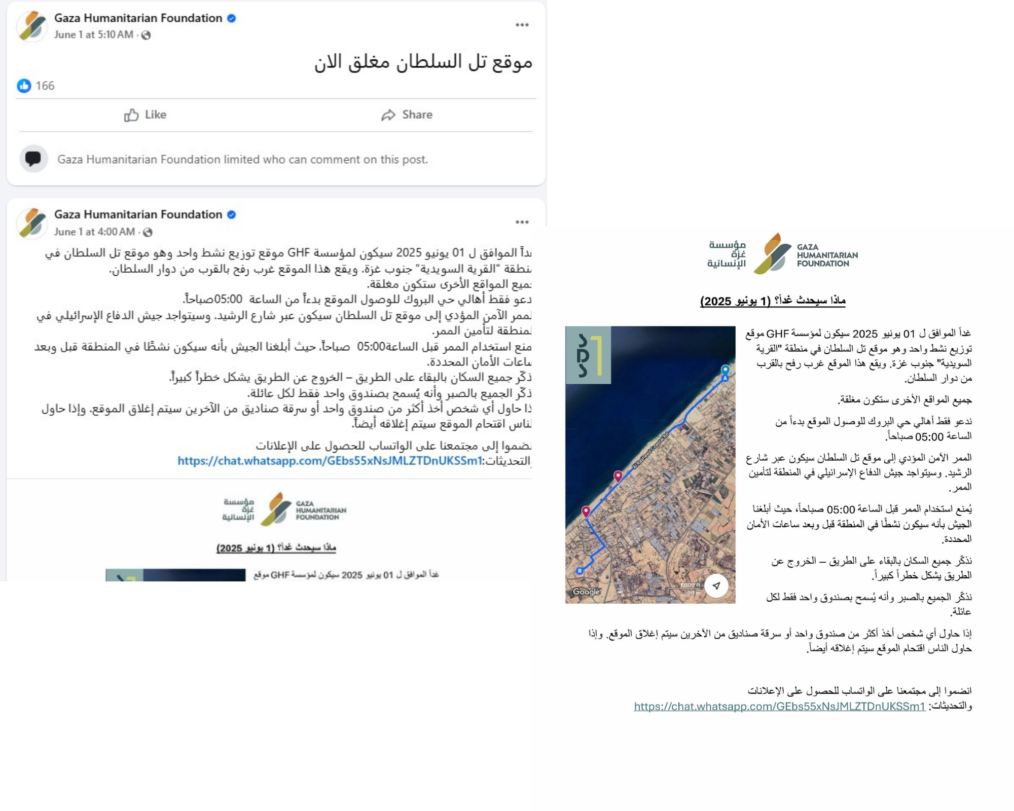 عثر على منشورها عند الرابعة صباحًا: “سيكون للمؤسسة موقع توزيع واحد في تل السلطان جنوب غزة، ندعو الأهالي للوصول للموقع بدءًا من الساعة 05:00 صباحاً.. الممر الآمن سيكون عبر شارع الرشيد. وسيتواجد جيش الدفاع الإسرائيلي في المنطقة لتأمين الممر!.. يُمنع استخدام الممر قبل هذه الساعة”.