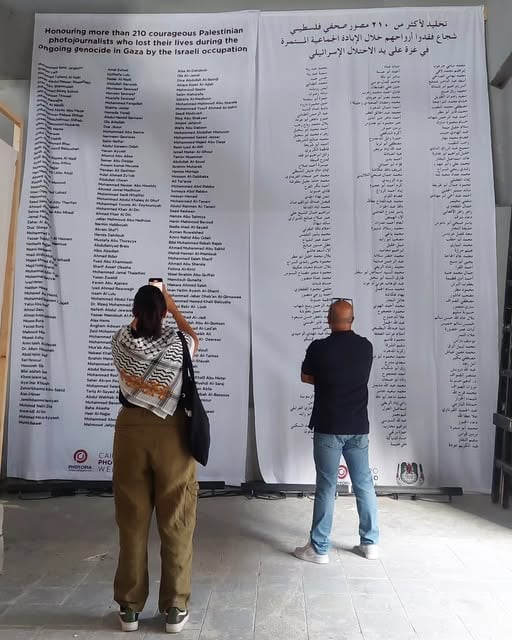 ولمدة 11 يومًا في وسط القاهرة، يستمر أسبوع القاهرة للصورة لتقديم تجربة تعليمية واستكشافية للمحترفين والجمهور على حد سواء، برعاية وزارتي السياحة والثقافة. وقد بدأ نسخته الحالية بعمل حائط تذكاري لتخليد اسم 210 صحفيًّا قُتلوا خلال حرب إسرائيل على غزة الدائرة منذ عام ونصف.