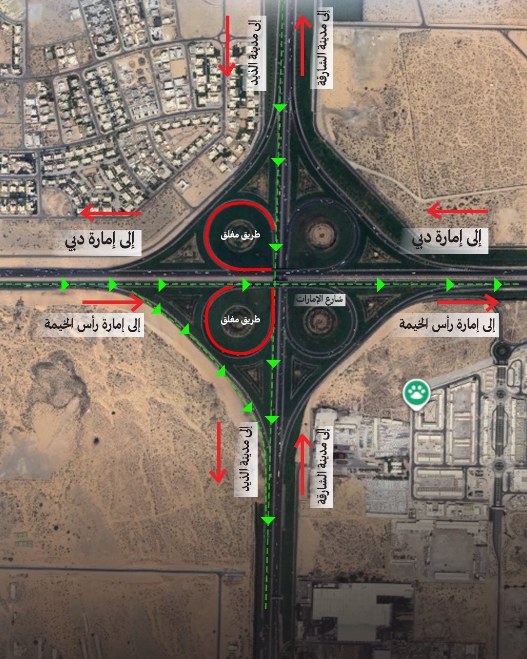 إغلاق مسار القادمين من الشارقة باتجاه رأس الخيمة عند الجسر (7) على شارع الإمارات