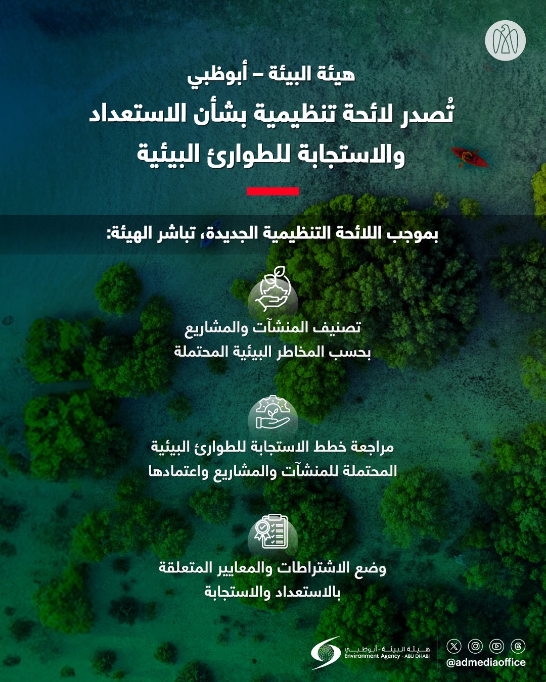أصدرت هيئة البيئة – أبوظبي لائحة تنظيمية بشأن الاستعداد والاستجابة للطوارئ البيئية في الإمارة. وتُمكِّن اللائحة الهيئة من اتخاذ إجراءات فورية وعاجلة عند حدوث أي طوارئ بيئية، وتقلل من الآثار والأضرار المترتبة عليها، ما يحقِّق حماية استباقية للبيئة.