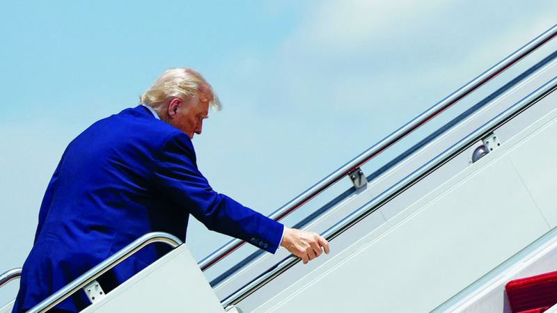 تعثر الرئيس الأميركي، دونالد ترامب، أثناء صعوده سلم طائرة الرئاسة، خلال عطلة نهاية الأسبوع، فبعد حديثه مع الصحافيين في موريس تاون بنيوجيرسي، الأحد الماضي، صعد إلى الطائرة في طريقه إلى كامب ديفيد، وكان وزير الخارجية، ماركو روبيو، يرافقه، لكنه تعثر أثناء صعوده السلم.