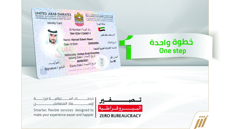 أعلنت الهيئة الاتحادية للهوية والجنسية والجمارك وأمن المنافذ تطوير خدمتَي استبدال وتجديد الهوية الإماراتية للمواطنين، من خلال اختصار الإجراءات في خطوة واحدة بدلاً من خطوات عدة، مع تحديد مدة صلاحية البطاقة تلقائياً استناداً إلى عُمر المستفيد من الخدمة، كما هو معمول به في خدمات جواز السفر الإماراتي، وذلك ضمن الدورة الثانية من برنامج تصفير البيروقراطية.