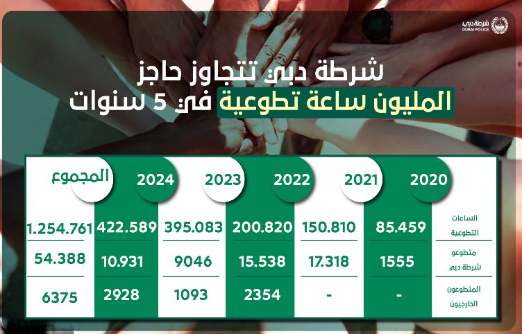 نجحت القيادة العامة لشرطة دبي في تحقيق إنجازات نوعية في مجال العمل التطوعي على مدار 5 سنوات، حيث بلغ عدد ساعات التطوع 1 مليون و254 ألفاً و761 ساعة نفذها موظفو شرطة دبي والمتطوعين الخارجيين من مختلف الجنسيات، ممن سجلوا في الفرص التطوعية التي توفرها منصة شرطة دبي للتطوع.
