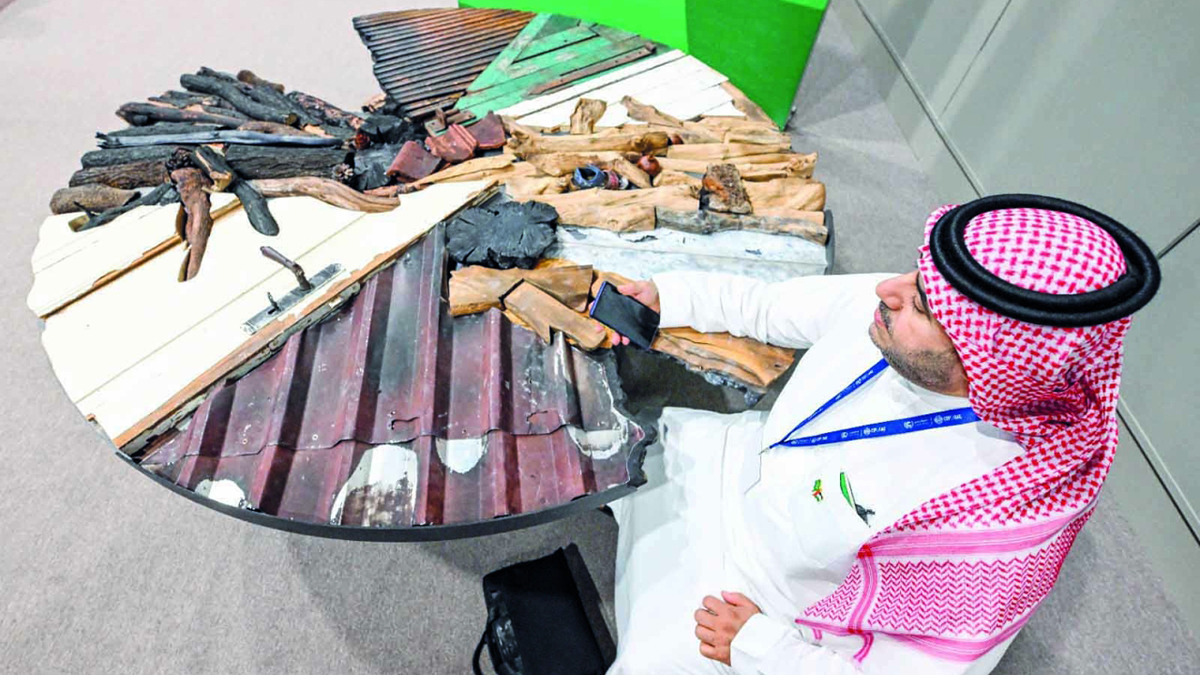 أغصان أشجار جافة متضررة من اليمن.. ألواح حائط متفحمة بسبب حرائق غابات إسبانيا.. أجزاء من منزل أوغندي جرفته الفيضانات.. وغيرها من العناصر المستخدمة في عمل على شكل طاولة، يجسّد بشكل فني تداعيات الكوارث المرتبطة بالمناخ في جميع أنحاء العالم، ويُعرض أمام العالم خلال مؤتمر «كوب 28» الذي تستضيفه مدينة إكسبو دبي حتى 12 من الشهر الجاري.
