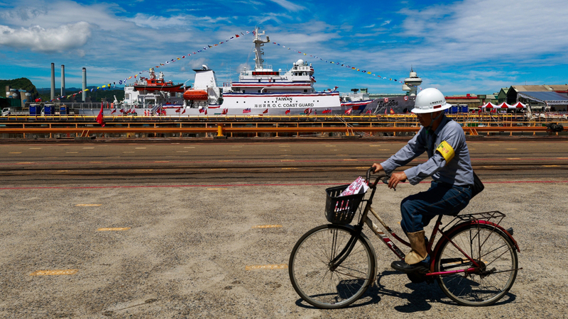 عامل تايواني يقود دراجة هوائية أمام فرقاطة «هوالين» التابعة لخفر السواحل، خلال حفل تسليمها في ميناء كيلونج، وتُعد سفينة الدورية هوالين، التي يبلغ وزنها ١٠٠٠ طن، جزءاً من برنامج تطوير أسطول خفر السواحل التايواني لتعزيز حماية السيادة الوطنية والأمن البحري، وكانت البحرية التايوانية قد نفذت تدريبات للتحقيق في استخدام سفن خفر السواحل كأصول بحرية خلال الحرب، وأُجريت التدريبات في مرافق تابعة للمعهد الوطني «تشونغ شان» للعلوم والتكنولوجيا شرق تايوان. إي.بي.إيه