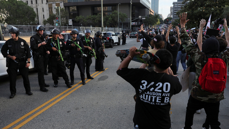 وأرسل الرئيس الأميركي، دونالد ترامب، مشاة البحرية إلى المدينة مع أفراد من الحرس الوطني في كاليفورنيا، الأسبوع الماضي، على الرغم من اعتراضات حاكم الولاية ورئيسة بلدية لوس أنجلوس، إذ دفعت حالة الغضب من مداهمات سلطات الهجرة آلاف المتظاهرين للخروج إلى الشوارع.