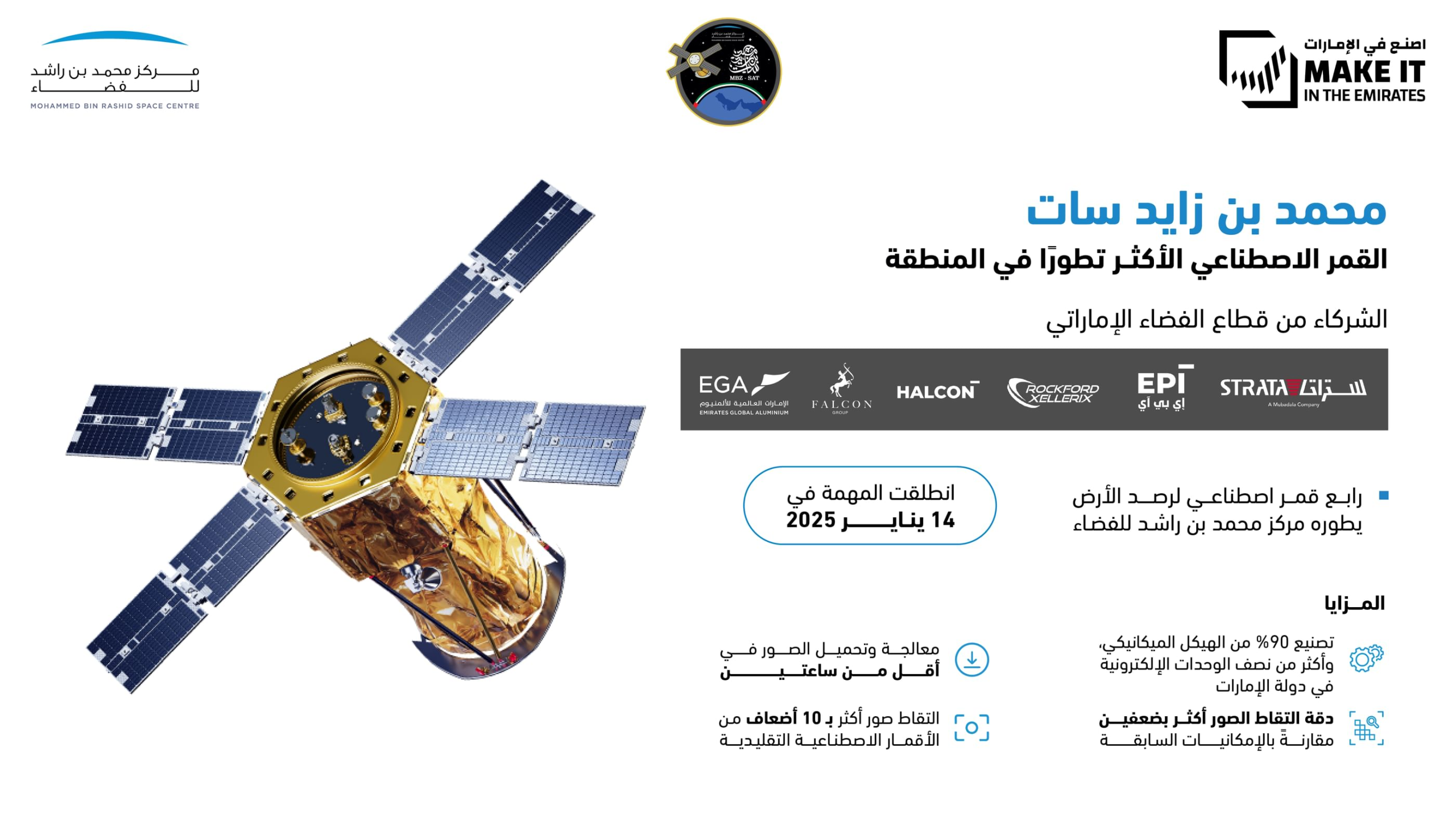 يشارك مركز محمد بن راشد للفضاء في الدورة الرابعة من معرض “اصنع في الإمارات 2025″، مستعرضاً القمر الاصطناعي “محمد بن زايد سات” الأكثر تقدماً في المنطقة كنموذج متكامل للتصنيع الفضائي القائم على الابتكار والشراكات الوطنية.