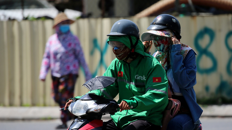 راكبان على دراجة يرتديان ملابس طويلة للحماية من أشعة الشمس في العاصمة الفيتنامية هانوي، حيث شهدت مناطق شمال ووسط البلاد موجة حر واسعة النطاق، مع وصول درجات الحرارة إلى 40 درجة مئوية.