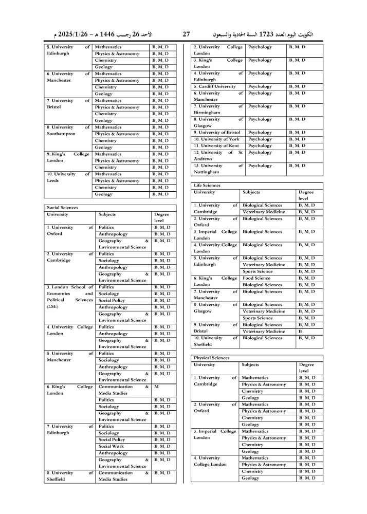 اعتماد قوائم التخصصات الأكاديمية المتميزة في مؤسسات التعليم العالي في المملكة المتحدة والمصنفة عالميا من قبل (The Times Higher Education) لدراسة برامج البكالوريوس والدراسات العليا على النحو التالي: