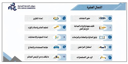 واشتملت المهام الـ 10 على إنجاز الموظف ما يكلفه به الرئيس المباشر، طباعة المستندات والنماذج، إعداد البحوث والإحصائيات، تسليم الصادر واستلام الوارد، إعداد التقارير، الرد على الاستفسارات، استقبال المراجعين، توثيق المذكرات والمعاملات والمراسلات وحضور الاجتماعات، وجاءت هذه المهام معدلة نسبيا عن المهام التي تم إعلانها في الورشة التعريفية والتي نشرتها «الأنباء» في 17 سبتمبر الماضي.