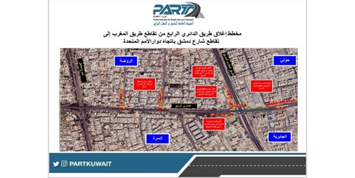 أعلنت الهيئة العامة للطرق والنقل البري، بالتعاون مع الإدارة العامة للمرور، عن إغلاق جزء من طريق الدائري الرابع باتجاه دوار الأمم المتحدة، اعتبارا من فجر أمس الجمعة 18 الجاري، وذلك ضمن أعمال الصيانة الجذرية للطريق.