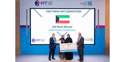 أحرزت الكويتية د.نوف الحمدان المركز الثالث في مسابقة “الأطروحة في ثلاث دقائق” بنسختها الأولى في الشرق الأوسط وشمال أفريقيا المقامة في العاصمة القطرية الدوحة.