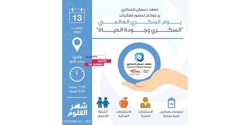 ينظم معهد دسمان للسكري فعاليات يوم السكري العالمي تحت شعار «السكري وجودة الحياة»، وذلك يوم الخميس 13 الجاري في مجمع الأڤنيوز ـ التوسعة الثانية.