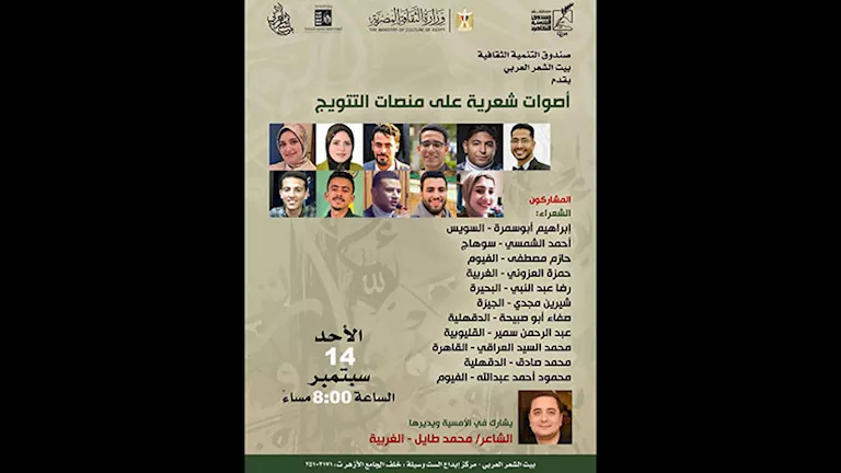 ينظم بيت الشعر العربي، التابع لصندوق التنمية الثقافية، أمسية شعرية بعنوان “أصوات شعرية على منصات التتويج”، وذلك في الثامنة من مساء اليوم الأحد 14 سبتمبر، بمقر البيت بمركز إبداع الست وسيلة خلف الجامع الأزهر.