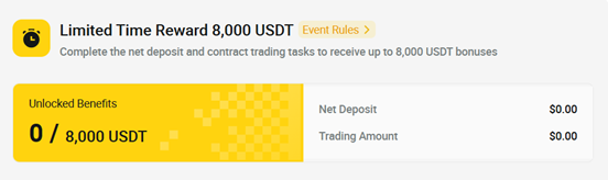 يعد التحدي محدود-الوقت أحد أهم مميزات هذه الحملة. في غضون سبعة أيام من التسجيل، يمكن للمستخدمين الحصول على ما يصل إلى 8000 USDT في مكافأة لتداول العقود من خلال تحقيق أهداف الإيداع التراكمي وحجم التداول. يمكن استخدام هذه المكافآت بشكل مباشر لتداول العقود، مما يوفر للمستخدمين فرصة منخفضة المخاطر وعالية المكافأة مع مساعدتهم على التعرف على أدوات التداول ذات الرافعة المالية العالية .