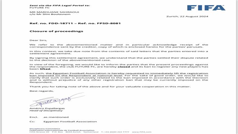بخطاب رسمي..فيفا يعلن رفع إيقاف قيد هدا النادي