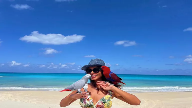 شاركت الفنانة نسرين أمين، متابعيها عبر السوشيال ميديا، صورتين لها مع “بغبغان” أمام البحر.