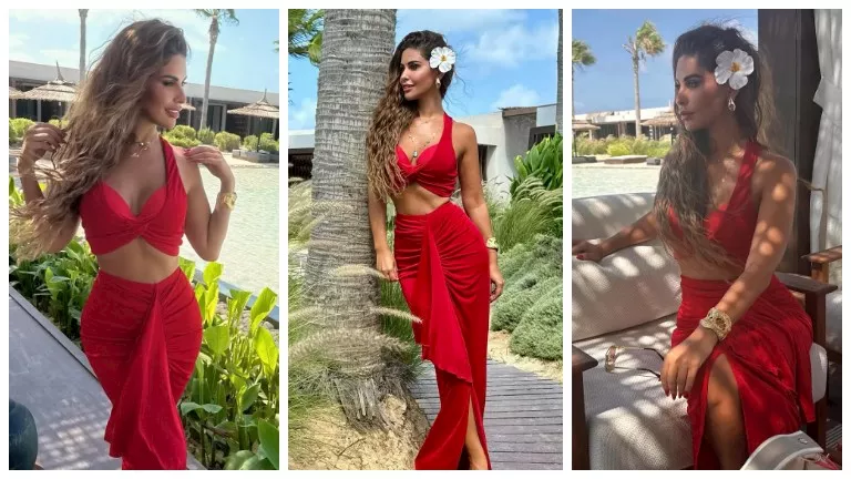 بفستان أحمر جريء.. مي سليم تستمتع بآخر أيام الصيفية