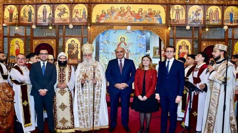 وقرأ السفير المصري نص التهنئة التي بعث بها الرئيس عبد الفتاح السيسي بمناسبة عيد الميلاد المجيد، للمصريين في الخارج.