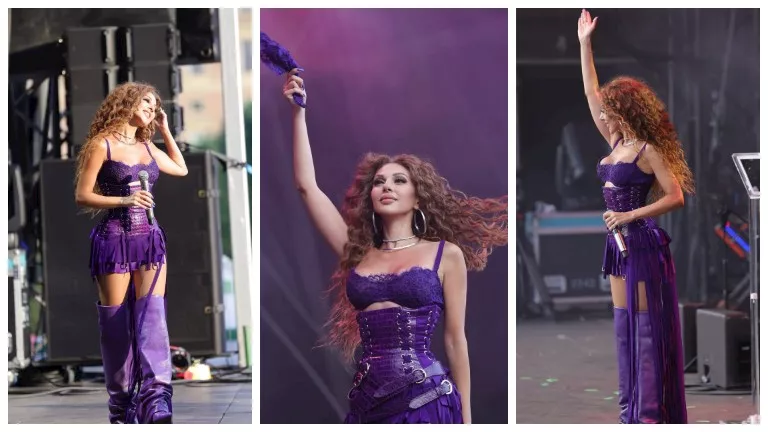 وظهرت ميريام خلال الحفل وهي ترقص وتغني بإطلالة جريئة لفتت الأنظار، وارتدت فستانًا قصيرًا باللون البنفسجي، مصنوعًا من الدانتيل والجلد.