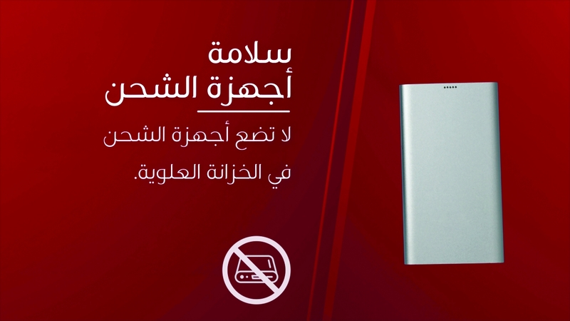 وتشمل اللوائح الجديدة لـ«طيران الإمارات» أنه يمكن للعملاء حمل وحدة شحن واحدة فقط تقل سعتها عن 100 واط/ساعة، ولا يجوز استخدام وحدات شحن الأجهزة المحمولة لشحن أي جهاز شخصي على متن الطائرة، ويُحظر توصيل وحدات الشحن بمصادر الطاقة داخل الطائرة لشحنها، ويجب أن تتضمن كل وحدة شحن يتم قبولها معلومات واضحة عن سعتها الكهربائية، ولا يجوز وضع وحدات الشحن المحمولة في الخزائن العلوية داخل المقصورة، ويجب وضعها في جيب المقعد أو في حقيبة تحت المقعد الأمامي، ويُحظر وضع وحدات شحن الأجهزة المحمولة في الأمتعة المسجلة، وفقاً للإجراء المعتمد حالياً.