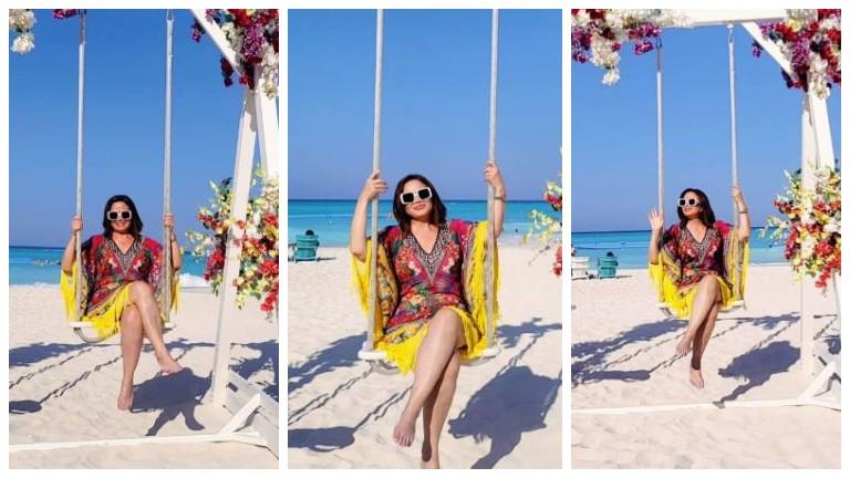 وظهرت إلهام شاهين بالصور وهي على “مرجيحة” على أحد الشواطئ والتقطت عدد من الصور التذكارية.