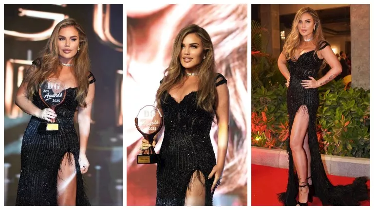 نشرت الفنانة اللبنانية نبكول سابا مجموعة صور من تكريمها أمس في حفل جوائز الديرجيست، وظهرت بإطلالة أنيقة وفستان أسود بفتحة ساق طويلة ومزين بالريش.