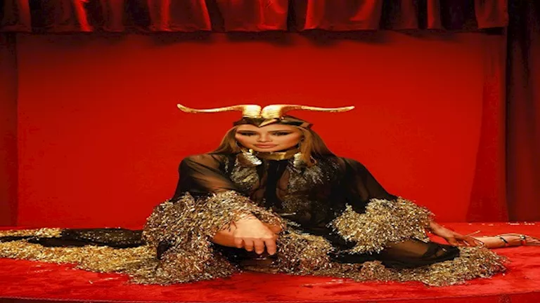 فقد اختارت فستاناً أسود ضيقاً يبرز جمال قوامها، لكن اللافت فيه كان الأكمام الشفافة والوشاح الذهبي اللامع الذي يغطي جزءًا من كتفها. والأكثر جرأة هو التاج الذهبي الفريد الذي وضعته على رأسها، والذي صُمم على شكل رأس كبش بقرون كبيرة. هذا التاج، بالإضافة إلى المكياج الترابي، أضفى على الإطلالة طابعًا ملكيًا وغامضًا في آن واحد، ليُثبت مرة أخرى أن مايا دياب سيدة الموضة الجريئة.