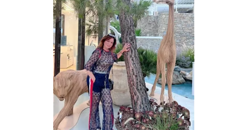 ارتدت الفنانة إلهام شاهين بلوزة شفافة باللون الأزرق الداكن، مزينة بنقوش من الدانتيل بأكمام طويلة شفافة، ونسقت معها بنطلون واسع بنفس نقشة البلوزة يتميز بخطين جانبيين عريضين باللون الأحمر يمتدان على طول الساقين.