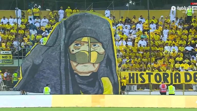 وشهدت مدرجات المباراة قبل انطلاقها، لفتة طيبة من قبل جمهور نادي الوصل الذي رفع تيفو ضخم يحمل صورة سيدة.