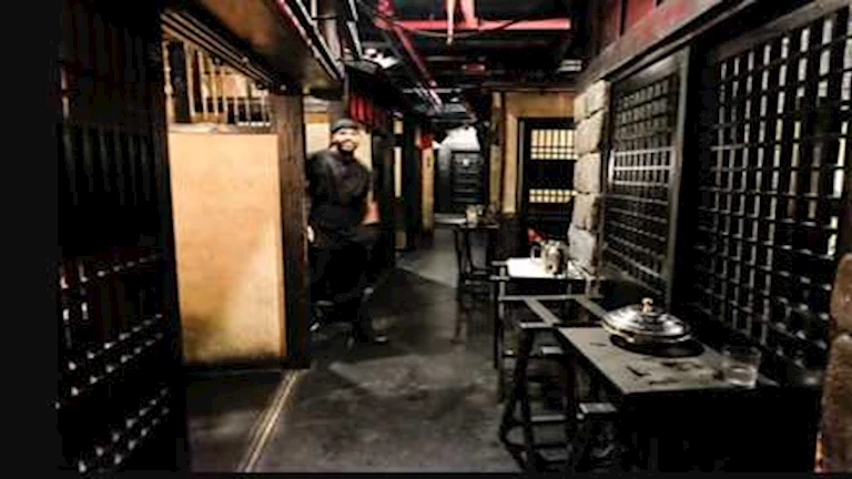 هذا المطعم تجربة فريدة تبدأ بمتاهة مظلمة مليئة بالدخان وتوصلك إلى طاولتك بواسطة محاربين مقنعين التي قد تكون في غرفة تشبه زنزانة السجن.