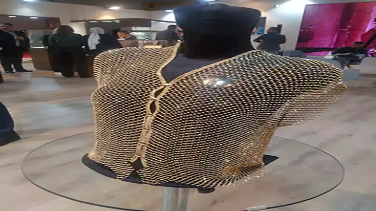 ولفتت الأنظار قطعة فريدة تُجسد الدقة الحرفية، وهي شال ذهبي يزن نحو 4 كيلو جرام، من عيار 18.