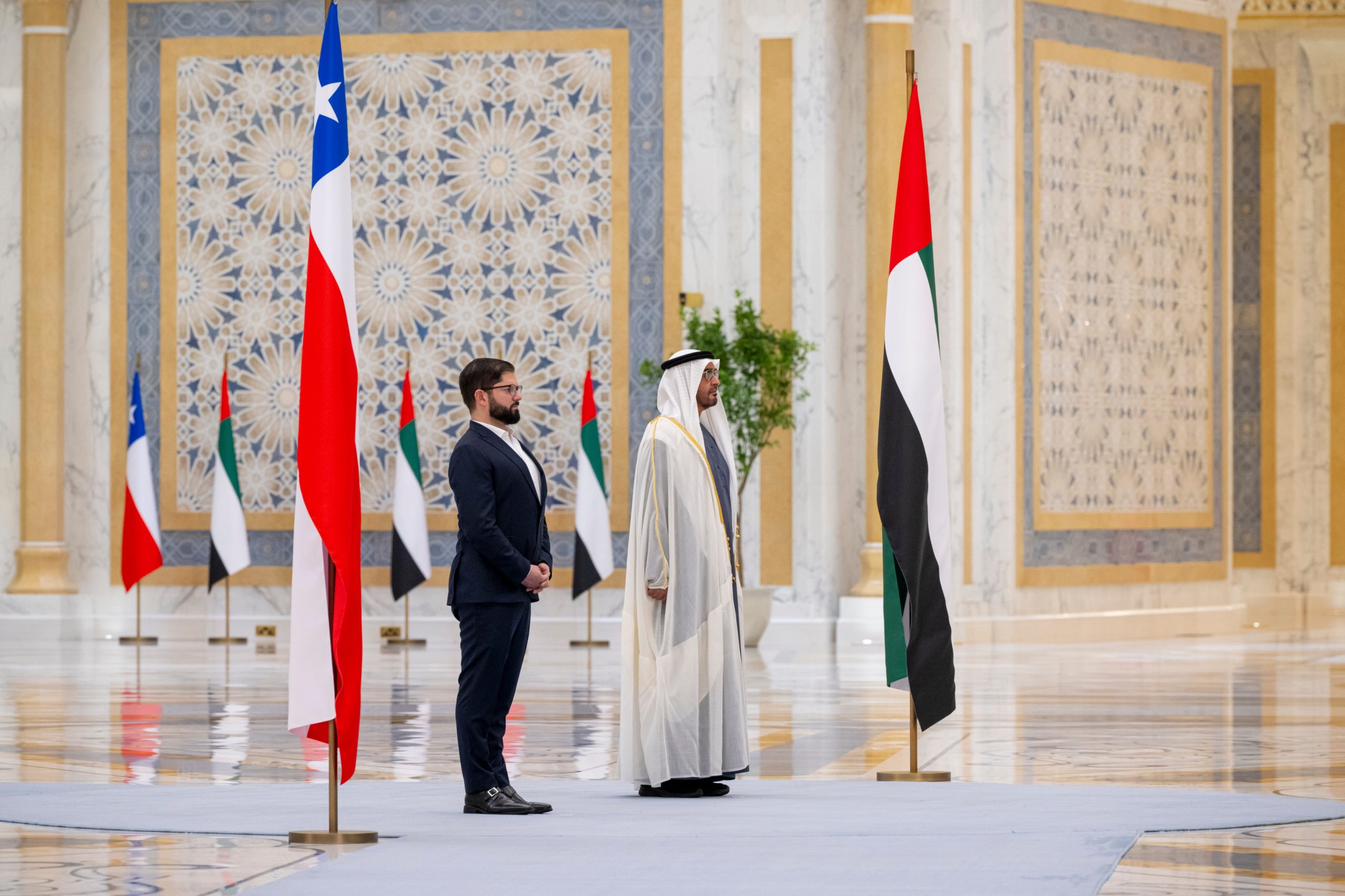 شهد صاحب السمو الشيخ محمد بن زايد آل نهيان رئيس الدولة “حفظه الله”، وفخامة غابرييل بوريك فونت رئيس جمهورية تشيلي، اليوم، مراسم توقيع “اتفاقية الشراكة الاقتصادية الشاملة ” بين دولة الإمارات وتشيلي، وذلك في إطار الزيارة الرسمية التي يقوم بها رئيس تشيلي إلى الدولة.