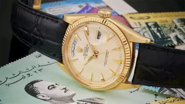 كان الرئيس ناصر معروفًا دائمًا بأنه “رجل الشعب”، وكان متاحًا لعامة الناس، لذا لم يكن لديه العديد من الممتلكات المادية. كانت ساعة رولكس داي في الواقع هدية، وعند النظر إلى الجهة الخلفية لها، يظهر نقش باللغة العربية مكتوب عليه: “السيد أنور السادات 26-9-1963”. أنور السادات، الذي أصبح نائب رئيس مصر في عام 1969 ثم رئيسًا في عام 1970، كان صديقًا مدى الحياة لجمال عبد الناصر.