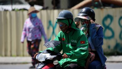 راكبان على دراجة يرتديان ملابس طويلة للحماية من أشعة الشمس في العاصمة الفيتنامية هانوي، حيث شهدت مناطق شمال ووسط البلاد…