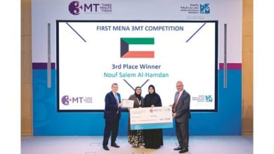 أحرزت الكويتية د.نوف الحمدان المركز الثالث في مسابقة «الأطروحة في ثلاث دقائق» بنسختها الأولى في الشرق الأوسط وشمال افريقيا المقامة…