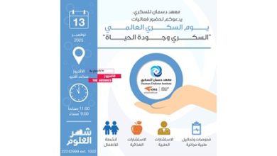 ينظم معهد دسمان للسكري فعاليات يوم السكري العالمي تحت شعار «السكري وجودة الحياة»، وذلك يوم الخميس 13 الجاري في مجمع…
