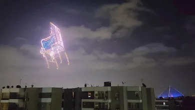 استعدادًا للافتتاح.. قناع توت عنخ آمون يُضئ سماء الأهرامات- صور