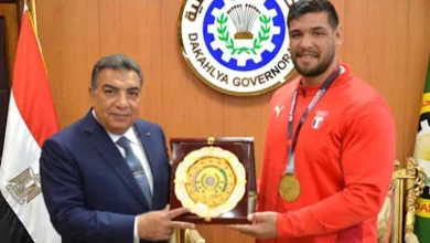محافظ الدقهلية يكرم عبداللطيف منيع الحاصل على ذهبية المصارعة -صور
