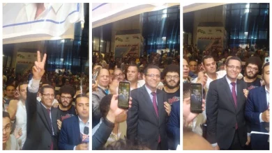 خالد البلشي يرفع علامة النصر بعد فوزه بمقعد نقيب الصحفيين