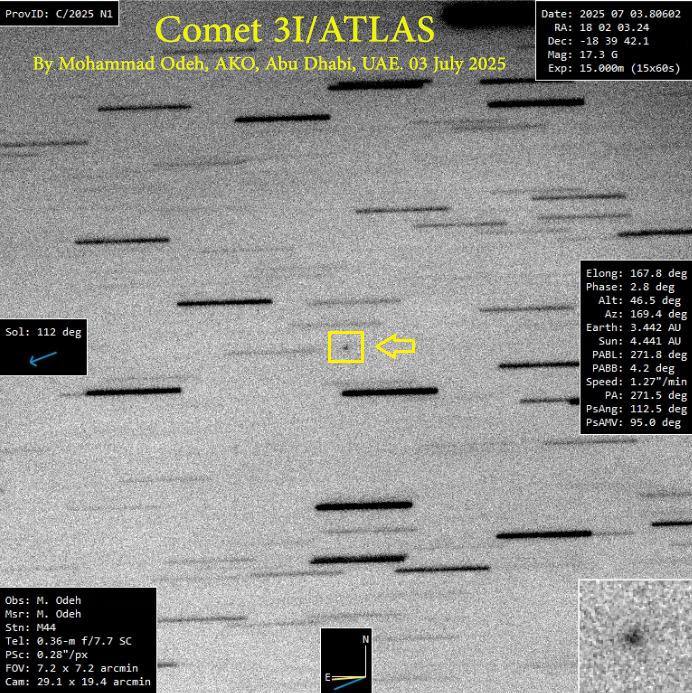 وقال المهندس محمد شوكت عودة مدير مركز الفلك الدولي إن مرصد الختم الفلكي الواقع في صحراء أبو أظبي تمكن من تصوير هذا المذنب مساء الخميس 03 يوليو، وقد كان رصد هذا الجرم صعبا نظرا لخفوت لمعانه، فهو يلمع الآن من القدر 17.5، أي أنه لا يرى إلا بالتلسكوبات الكبيرة.
